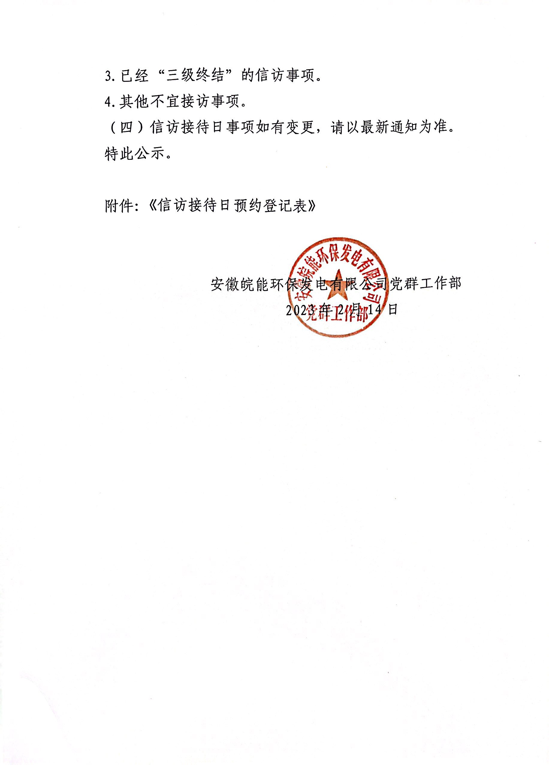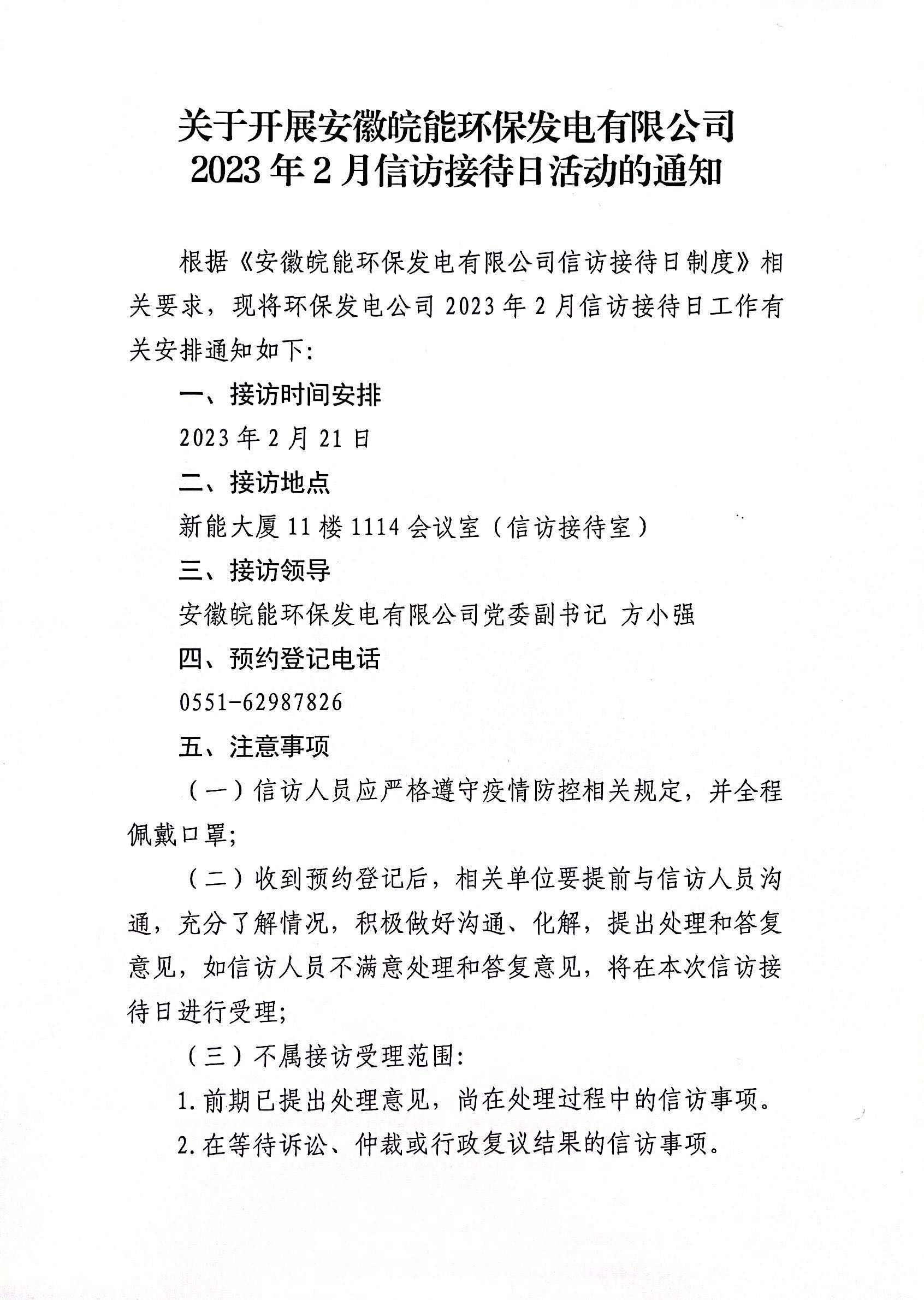 关于开展安徽皖能环保发电有限公司2023年2月信访接待日活动的通知