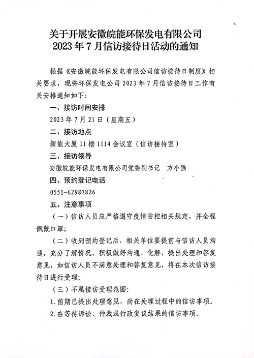 关于开展安徽皖能环保发电有限公司2023年7月信访接待日活动的通知