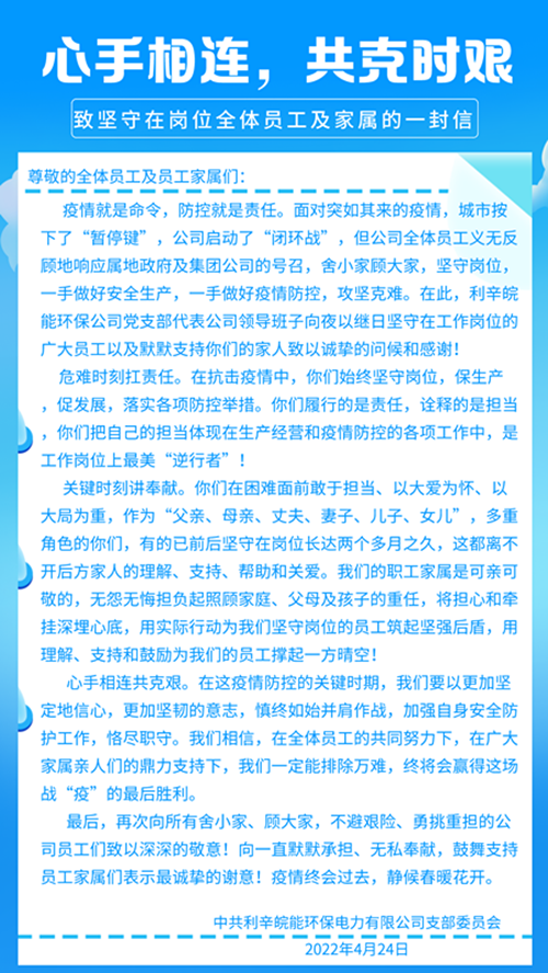 疫情封控管理区的“暖心家书”—利辛皖能环保公司党支部向坚守岗位的员工及家属致敬