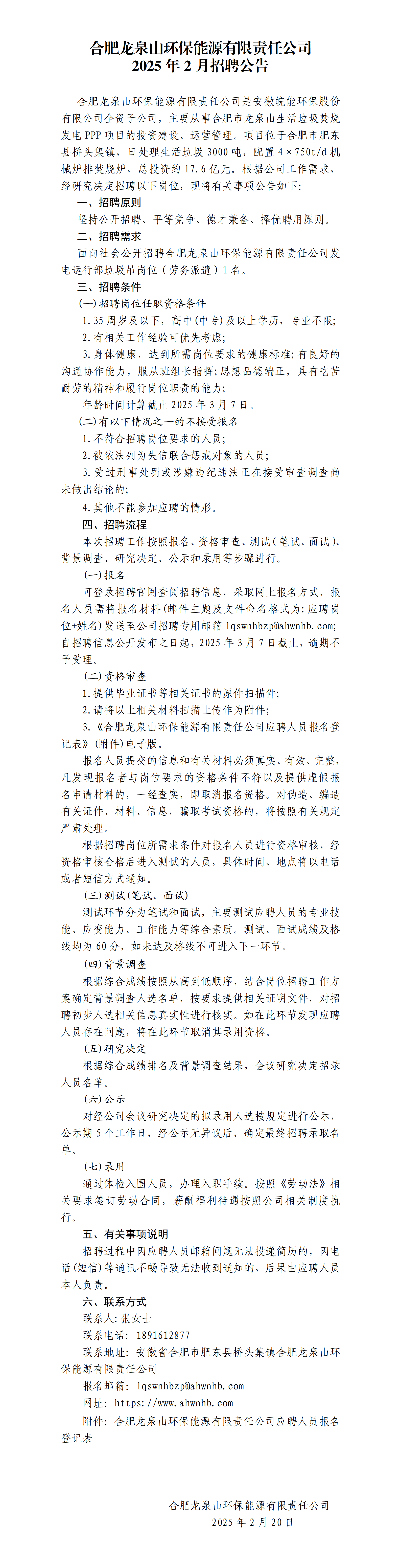 合肥龙泉山环保能源有限责任公司2025年2月招聘公告