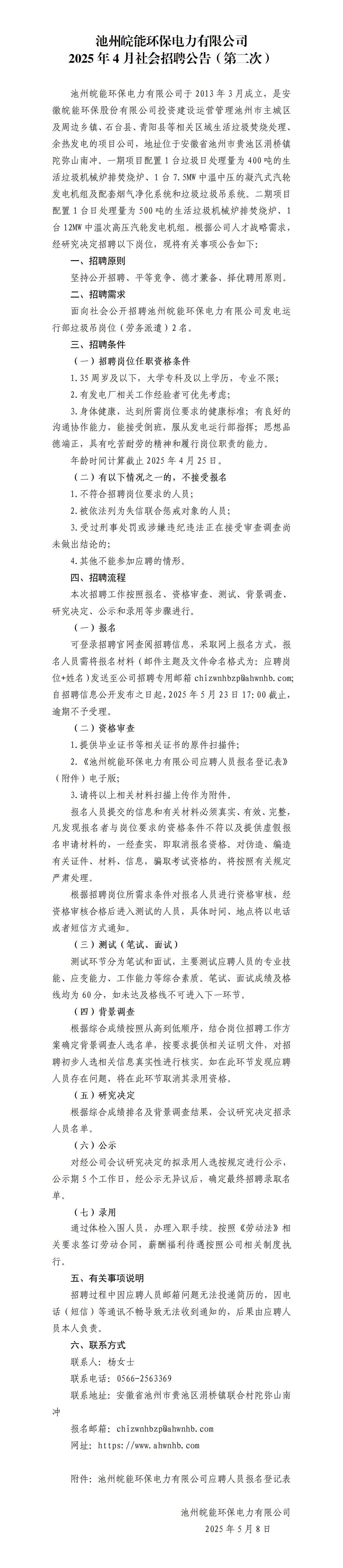 池州皖能环保电力有限公司2025年4月社会招聘公告(第二次)