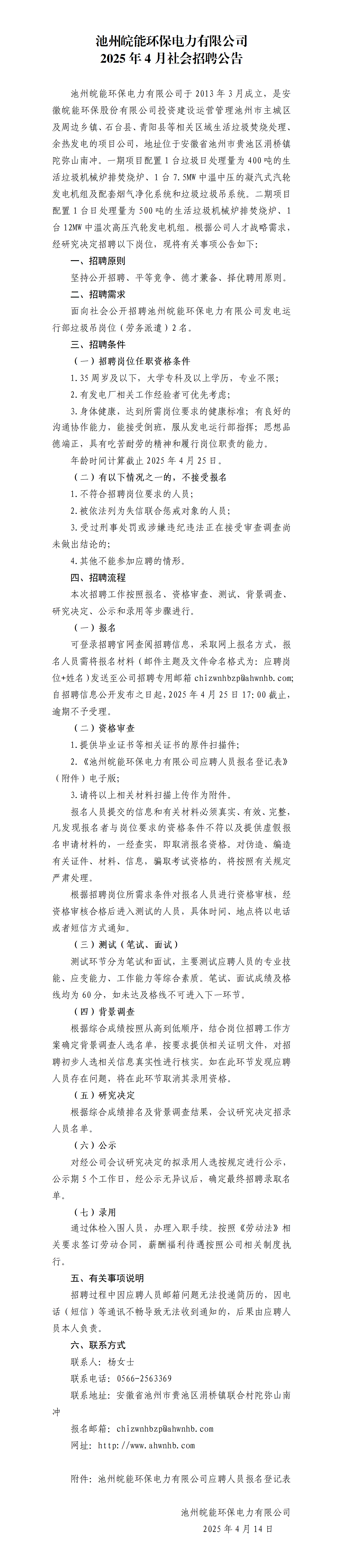 池州皖能环保电力有限公司2025年4月社会招聘公告