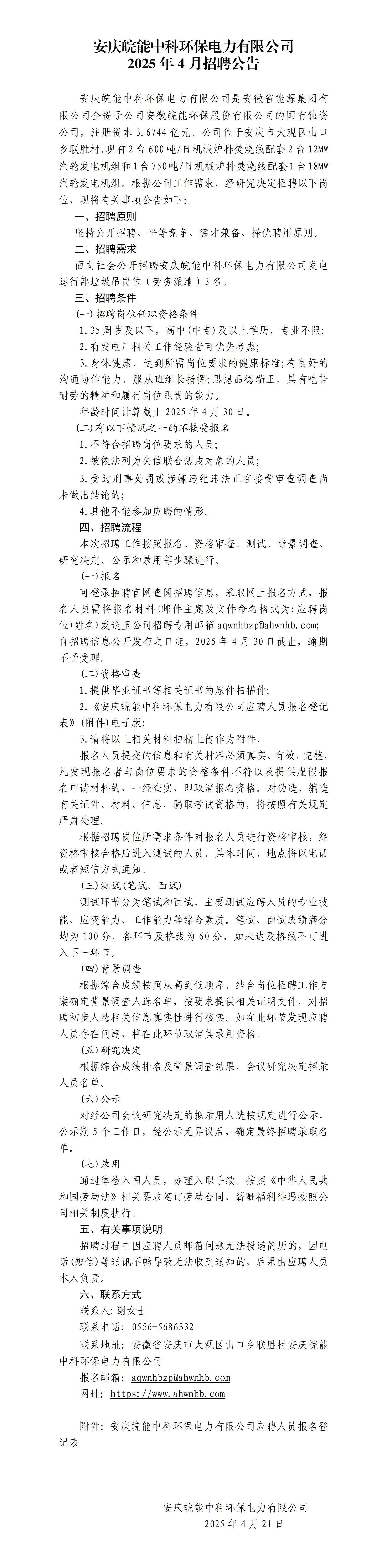 安庆皖能中科环保电力有限公司2025年4月招聘公告