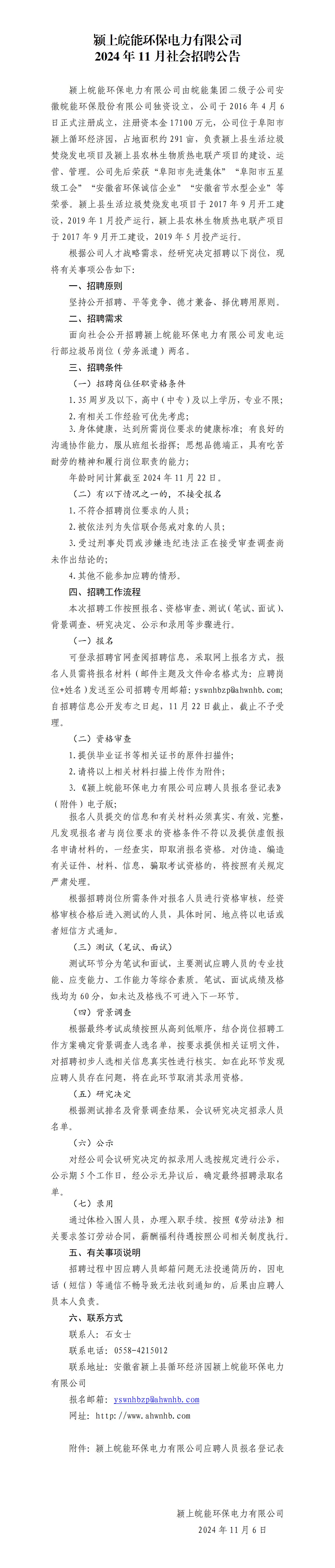 颍上皖能环保电力有限公司2024年11月社会招聘公告