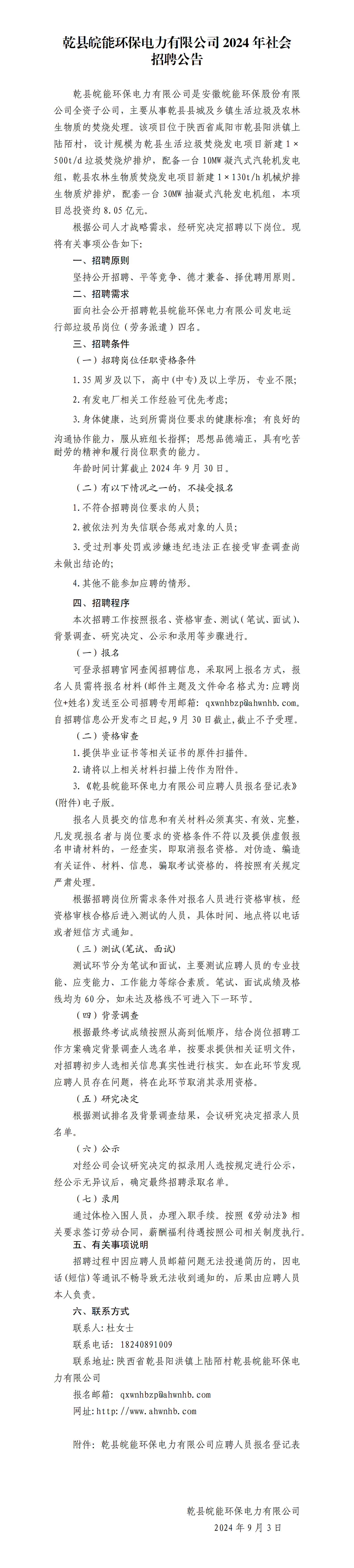 乾县皖能环保电力有限公司2024年社会招聘公告