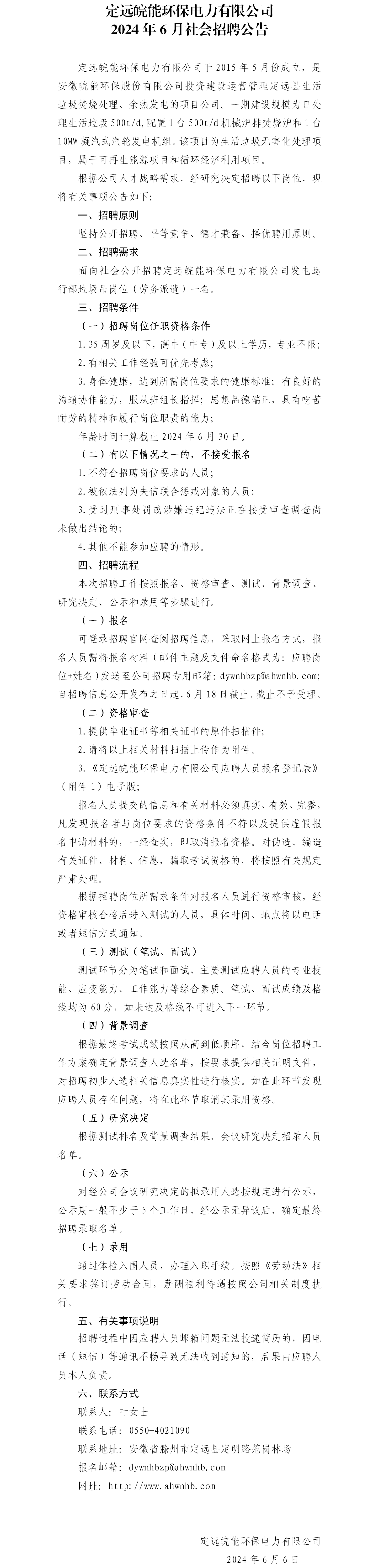 定远皖能环保电力有限公司2024年6月社会招聘