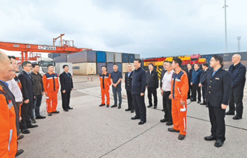 4月22日至24日,中共中央总书记、国家主席、中央军委主席习近平在重庆考察。这是22日下午,习近平在重庆国际物流枢纽园区重庆铁路集装箱中心站,同货车司机、列车司机、装卸工人、场站管理人员等亲切交流。新华社记者 王 晔摄