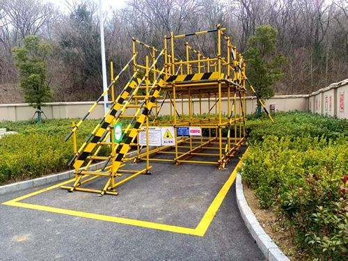 用标准,规范作业流程。为确保脚手架搭设的规范性和安全性,皖能环保公司在各子公司厂区内搭建了样板脚手架。样板严格按照标准选用Q235钢管,并设置了立杆、水平杆、剪刀撑、抛撑、上下通道等关键组件。同时,样板脚手架上悬挂了验收牌、安全警示标识和安全告知牌,确保作业人员在进场前能够对照样板进行培训和交底,统一标准,提升安全作业水平。