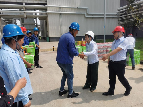 为保障高温天气下战斗在一线员工的身体健康,公司自成立以来,每年都会开展送清凉活动,。8月5日,环保发电公司财务总监胡珉及颍上皖能环保公司班子成员深入一线,为运检公司、料场、保洁、保安、渗滤液二期扩建项目部等10个劳务外委单位的一线员工送去了清凉。将一箱箱的红茶、绿茶、矿泉水、盐汽水等防暑降温物品亲自送到一线员工手中,并叮嘱他们要注意防暑降温和加强个人安全防护。