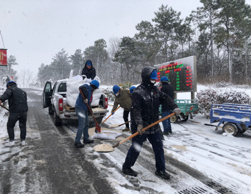 滁州皖能环保公司为确保公司安全生产有序进行,立即安排启动防雪灾防冰冻应急措施,在人流和物流主干道上铲雪、撒盐、除雪,在所有通往室外的通道以及户外的楼梯处都敷设防滑麻包,有效保障垃圾清运车辆交通安全和员工巡检安全,扎实践行了“我为群众办实事”。