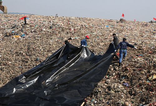 虽是初夏时节,但垃圾填埋区的异味还是难以忍受,大家顶着30度的高温,戴着口罩,合力将覆盖垃圾的专用膜推开,铺满垃圾表面,利用专用膜的高密闭性能和高抗拉强度对现有的垃圾堆体进行有效覆盖,不仅防火,更能起到防止垃圾堆体里面的气味逸散。