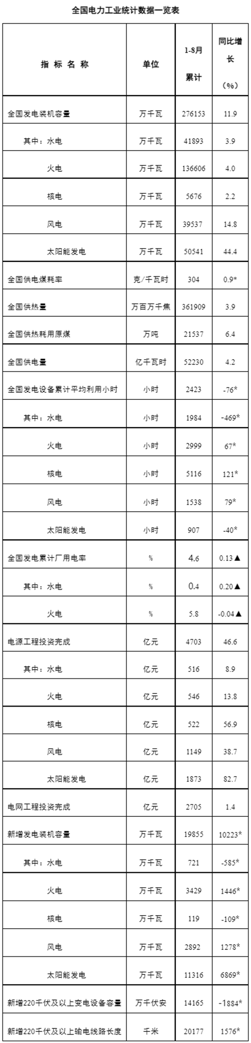 9月19日,国家能源局发布1-8月份全国电力工业统计数据。